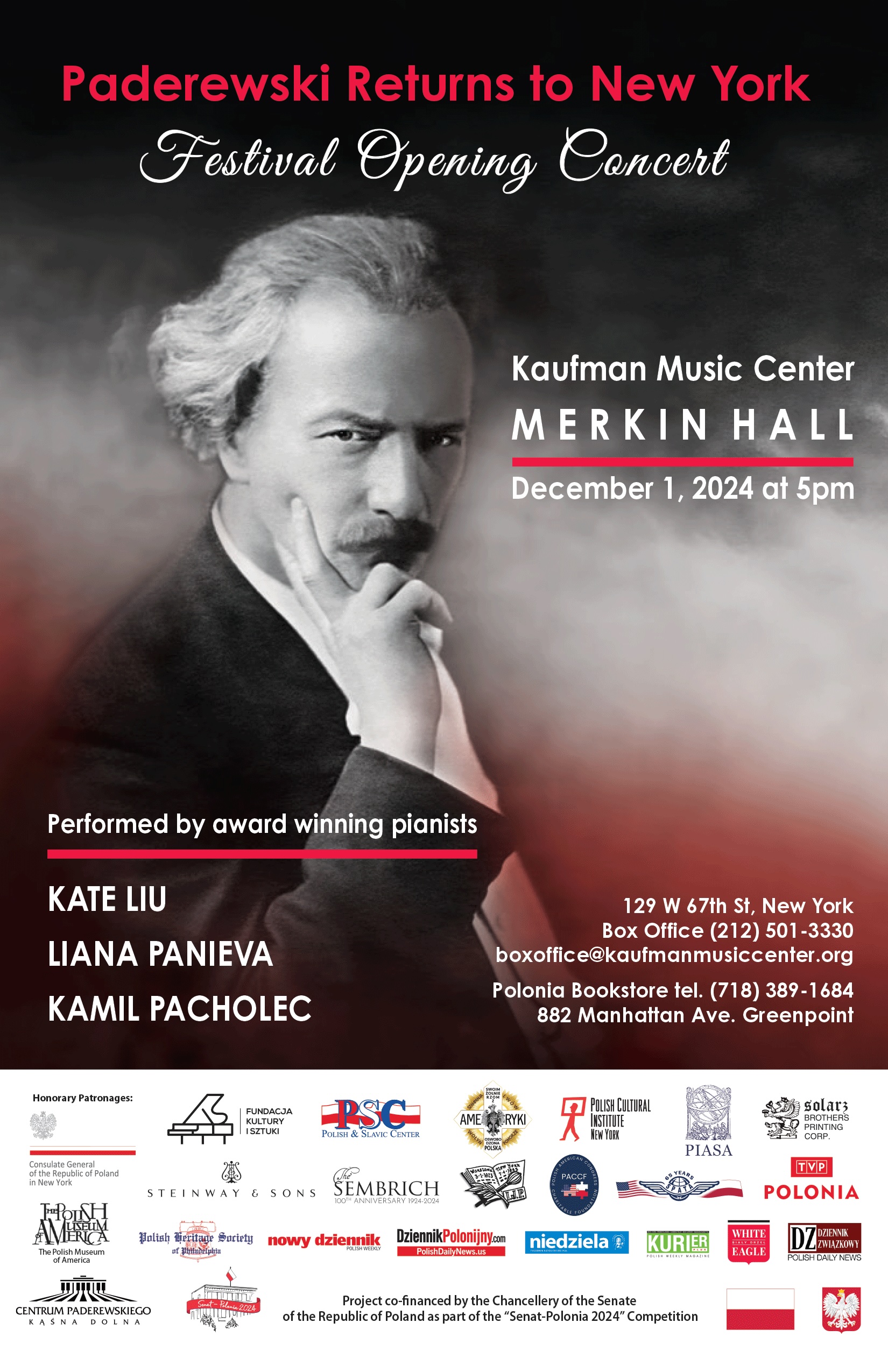 The event was held under the Honorary Patronage of Mateusz Sakowicz, Consul General of the Republic of Poland in New York and Ignacy Paderewski Center in Kąśna Dolna – the only preserved residence of Ignacy Jan Paderewski in the world. Partners: Polish Museum of America, The Sembrich – The Marcella Sembrich Foundation, Association of America (SWAP), Polish-Slavic Center, Polish American WE. Patronage: Steinway & Sons Company, Józef Piłsudski Institute of America, Polish Institute of Arts and Sciences of America (PIASA), Polish Heritage Society of Philadelphia, Society of Polish American Travel Agents (SPATA). In cooperation with the Polish Cultural Institute in New York. Media patronage: TVP Polonia, Nowy Dziennik, White Eagle, Dziennik Polonijny, Kurier Plus, Echo Polonijne, Dziennik Związkowy, Tygodnik Katolicki Niedziela, Super Express US.